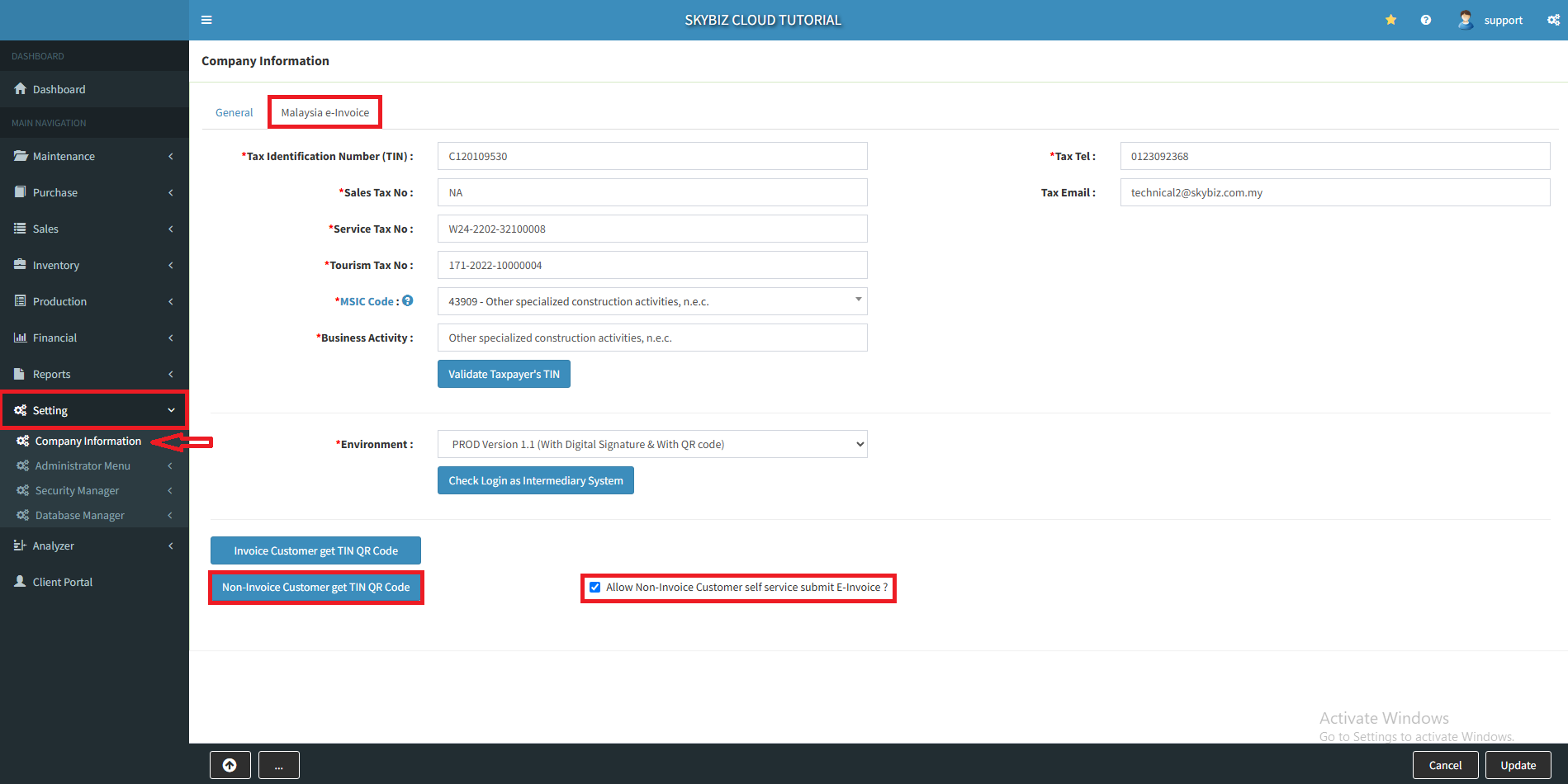 3. Click “Non-Invoice Customer get TIN QR Code“, if you untick means didn’t allow customer self service submit E-Invoice.