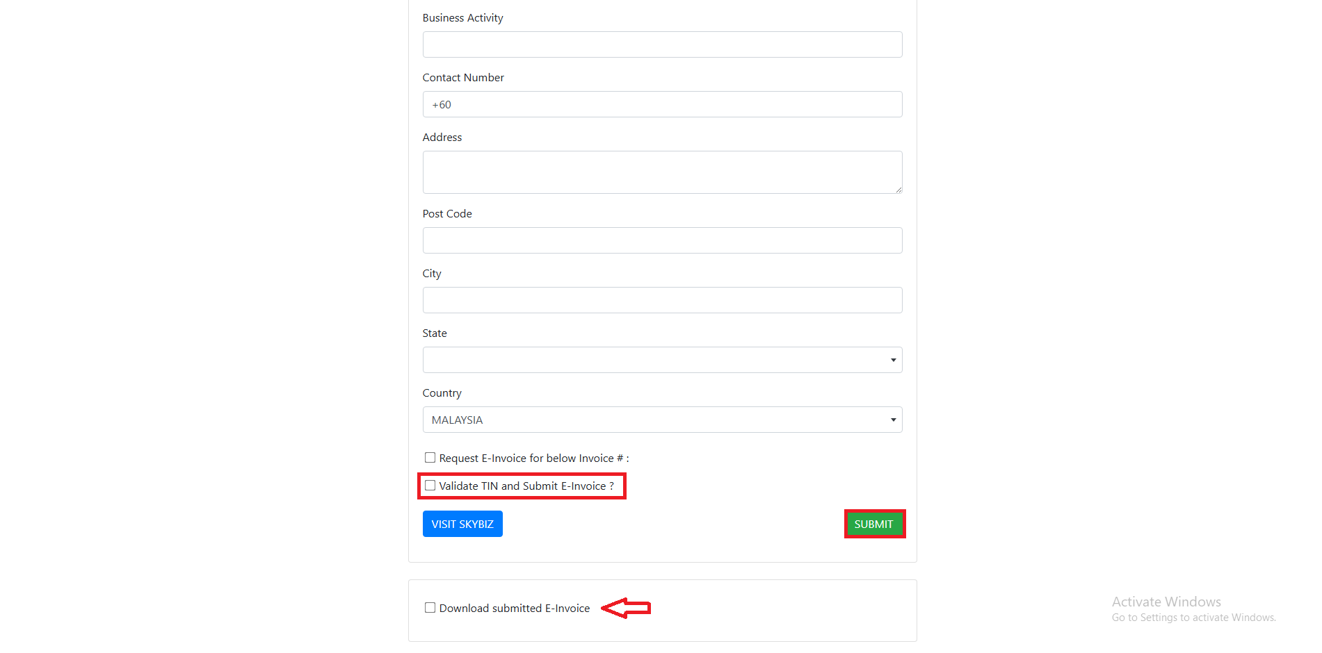 9. Scroll down to the bottom, tick “Validate TIN and Submit E-Invoice?” and click “Submit“. If you want to download you may tick “Download submitted E-Invoice?”