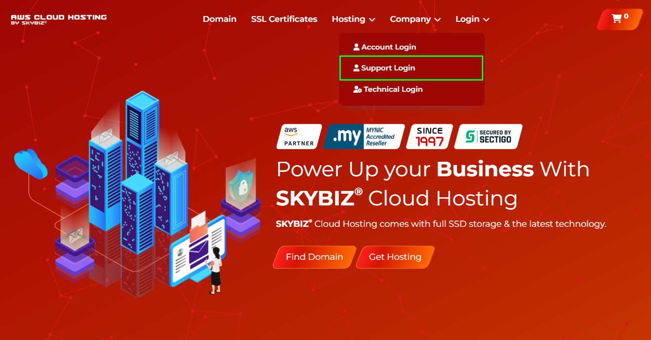 Step 1: Navigate to the official SKYBIZ website and select the Support Login option.