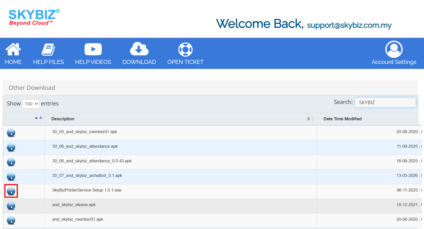 Step 2: Once logged in, navigate to the Download section and select the download icon to obtain the SKYBIZ Printer Service installer.
