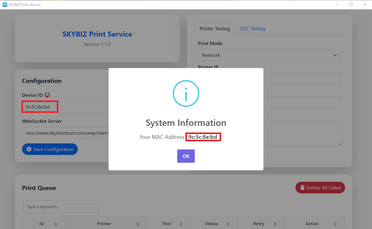 Step 4: Launch the SKYBIZ Printer Service and click the Red Computer Icon to retrieve your unique Device ID. Copy this ID and paste it into the field provided below, then click the Save Configuration button.