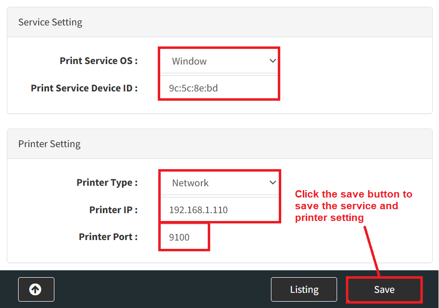 Step 9: Scroll to the service setting, select the appropriate Print Service OS and enter your Device ID. On the Printer Setting, set the Printer Type to Network, and input your printer’s IP Address and Port number. Click Save to apply these settings.