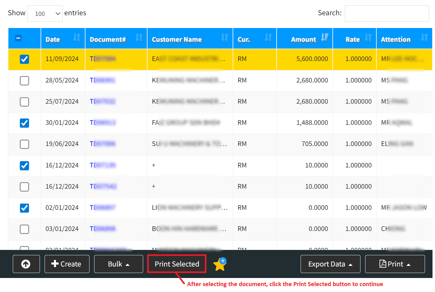Step 4: Select the Proforma Invoice document you want to print by ticking it, then click the Print Selected button