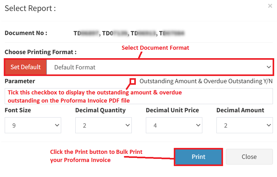 Step 5: Select the document format, then click the Print button to print all of your proforma invoices.