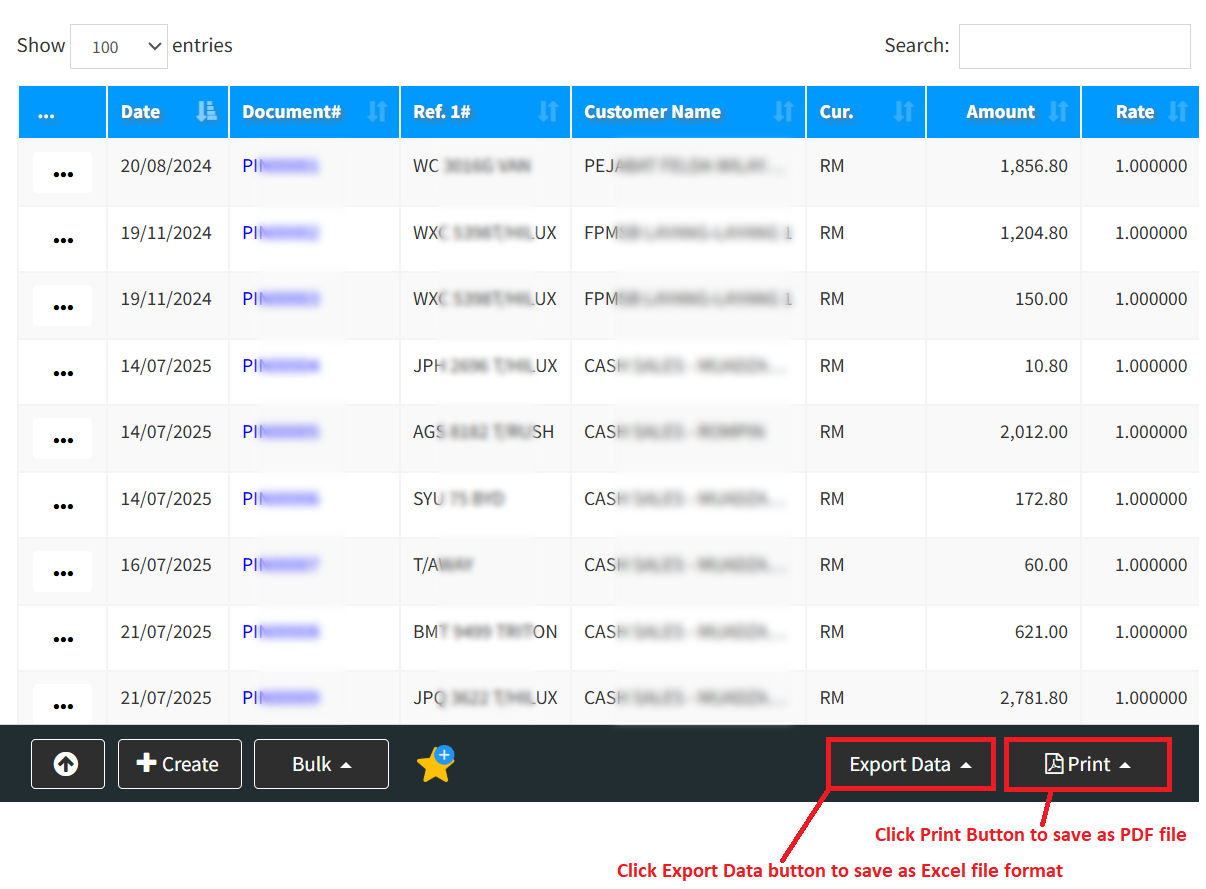 Step 4: Then click the Print button to save your Proforma Invoice listing as a PDF file or click the Export Data button to save it as an Excel format.