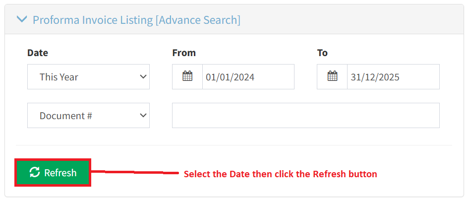Step 3: Use the Advanced Search to find and filter the specified Proforma Invoice listing that you want to print, then click the Refresh button.