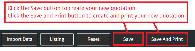 Step 4:  On the bottom right, click the Save button to create your quotation, or click the Save and Print button to create and print your new quotation simultaneously