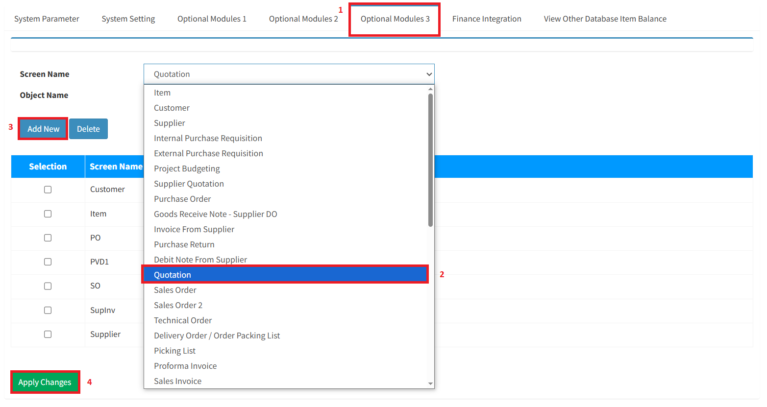Step 2: Click the Optional Modules 3 button. Select the Quotation for the Screen Name, then click the Add New button and the Apply Changes button.