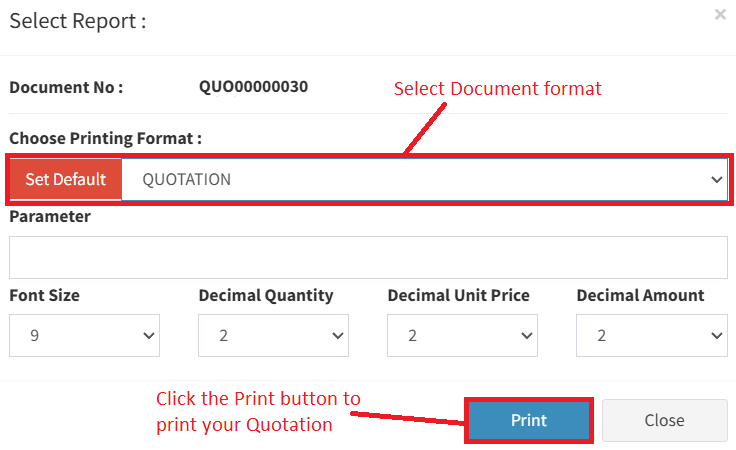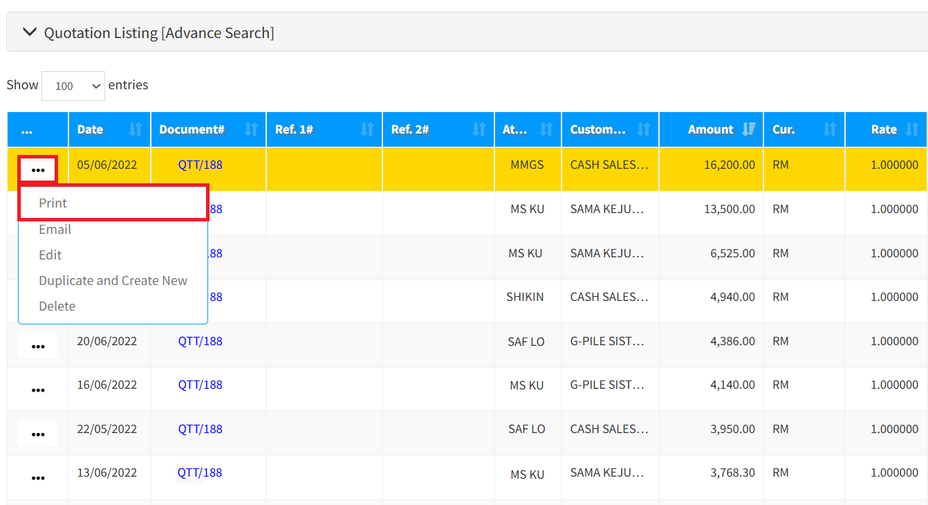 Step 3: Click the 3-Dots icon, then click the Print button to print your quotation