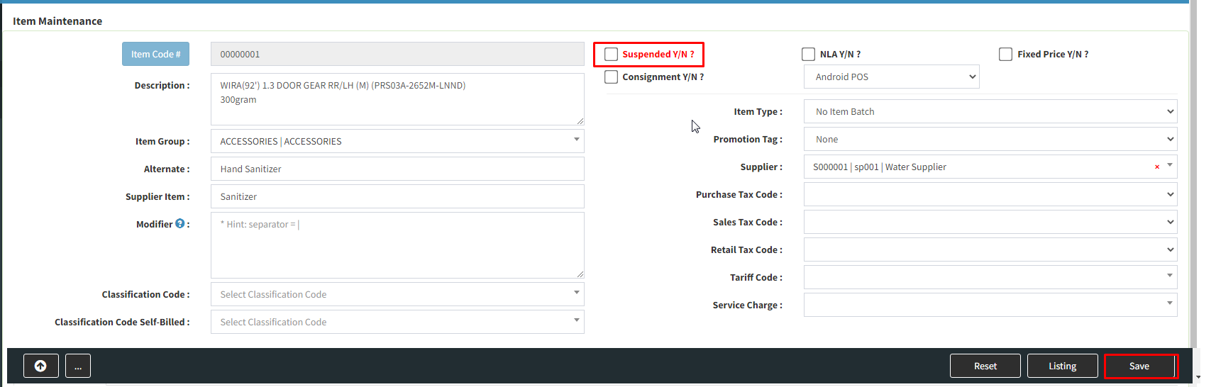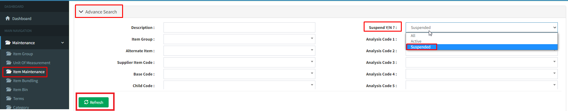 Step 2 : At right bottom of list box, click drop down icon and choose “Suspended” >> click “Refresh” >> double click the suspended item that you want to re-activate