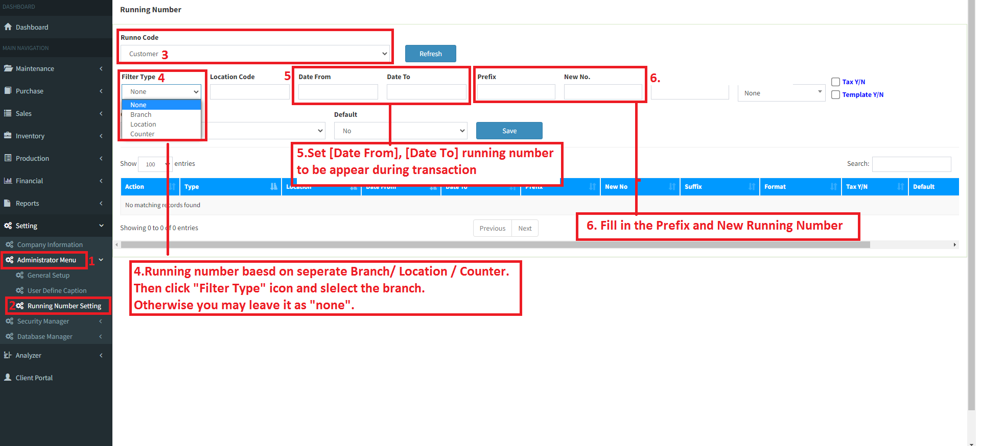 Step 1: Go to System >> Administrator Menu >> Running Number Setting