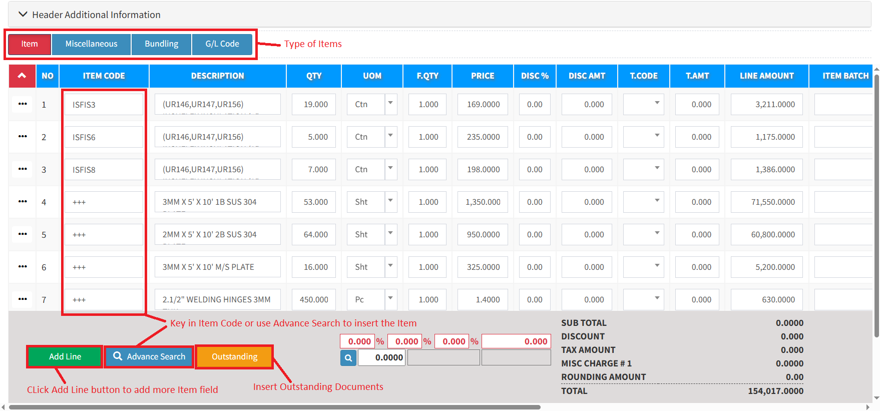 Step 3: Select the item type, then add all kinds of inventory items/miscellaneous/GL that you want to add: