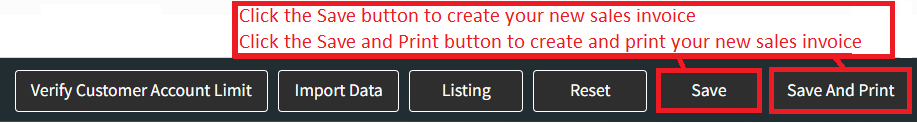 Step 5: On the bottom right, click the Save button to create your Sales Invoice, or click the Save and Print button to create and print your new Sales Invoice simultaneously.
