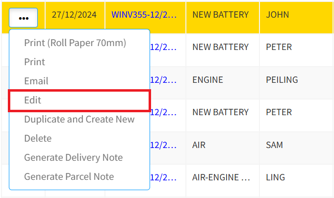 Step 3: Click the 3-Dots icon, then click Edit to modify your sales invoice