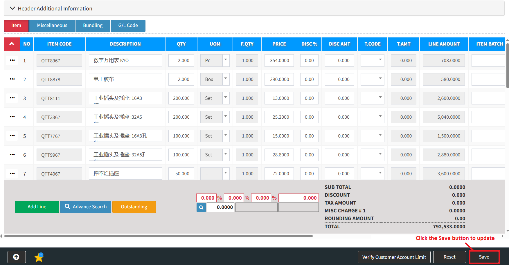Step 4: After modifying your sales invoice, click the Save button to update your sales invoice