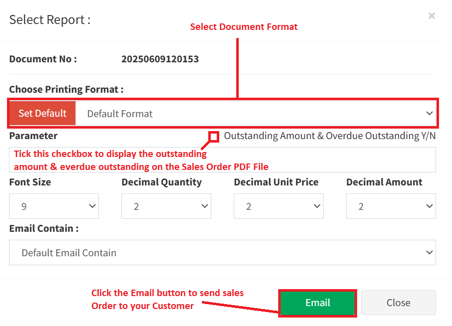 Step 4: Select the document format, then click the Email button to continue sending the sales order to your customer