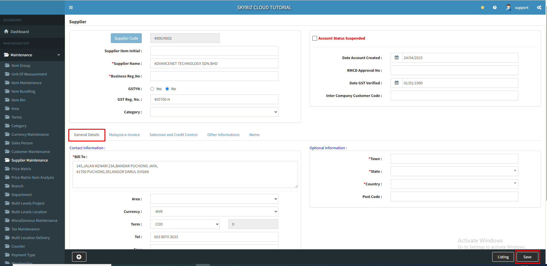 Step 2 : You will see supplier information [ General Details ] page as below. You are required to update some additional customer information into SKYBIZ customer module and click [ Save ]