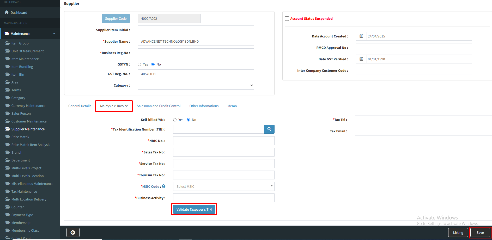 Step 3 : After fill in the supplier information go to >> [ Malaysia e-Invoice ]  key in the tax information and click [ Validate Taxpayer’s TIN ] and click [ Save ]