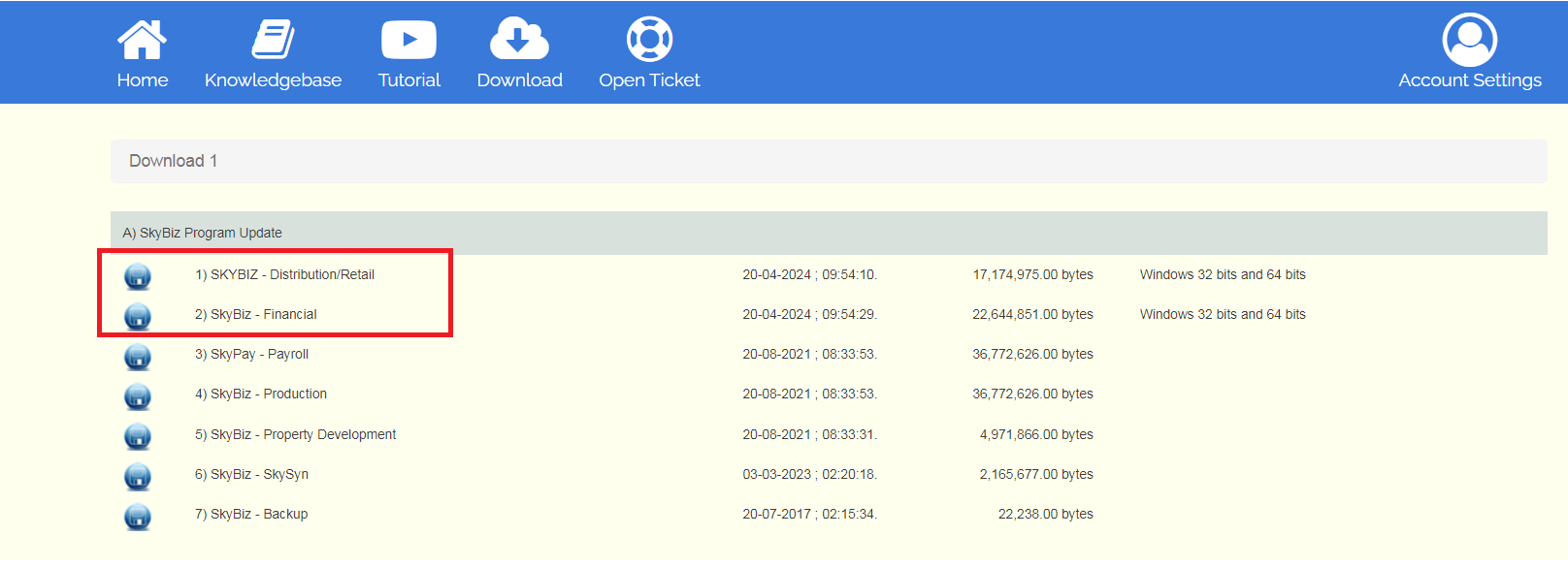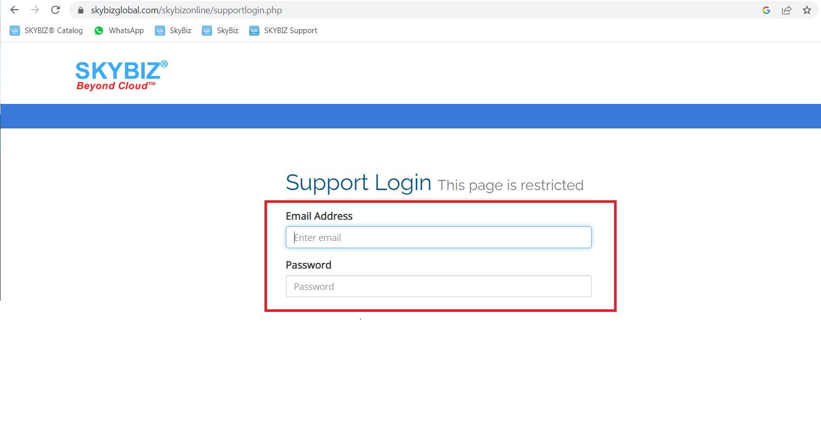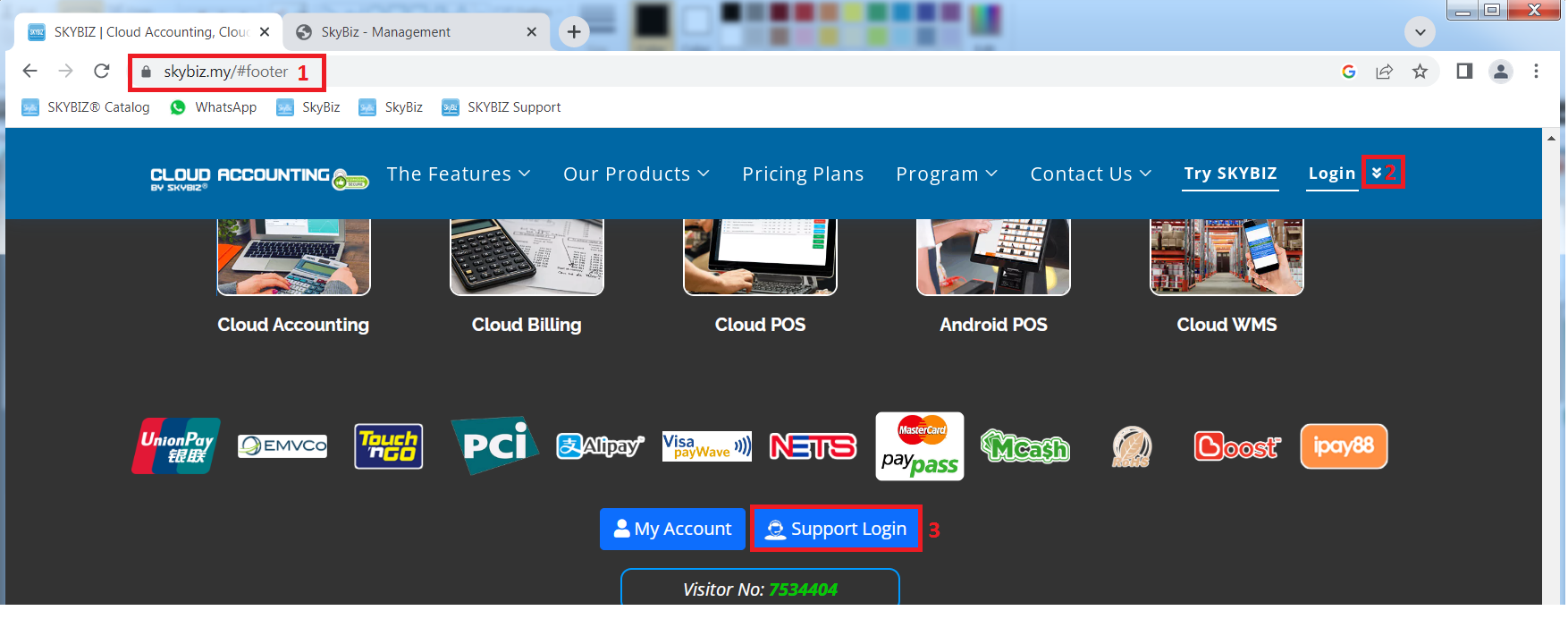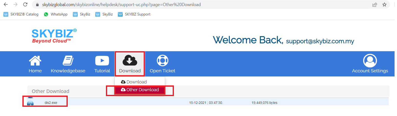 Step 1: Download the installation and patching files. First please goto www.skybiz.my, [top-right] please click the scroll down vv icon in order to fast go to bottom page. Then click on [Support Login] button which will direct you to SKYBIZ support portal login page.