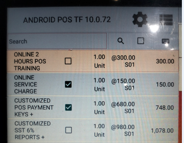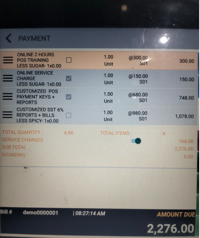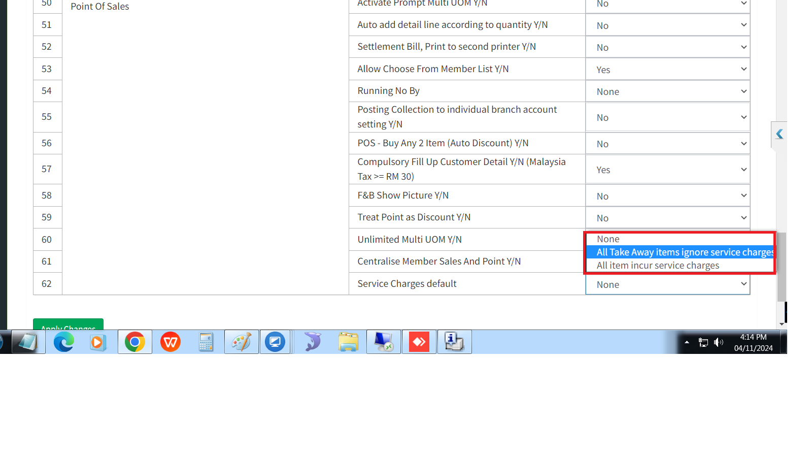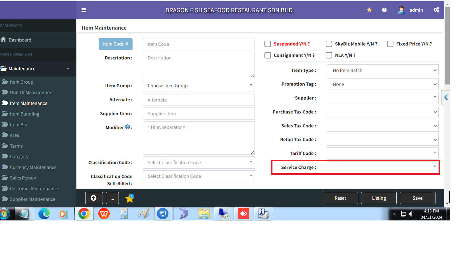 Option in Item Maintenance: User allow optionally choose and apply service charge for selected item(s), even with different service charge rate.