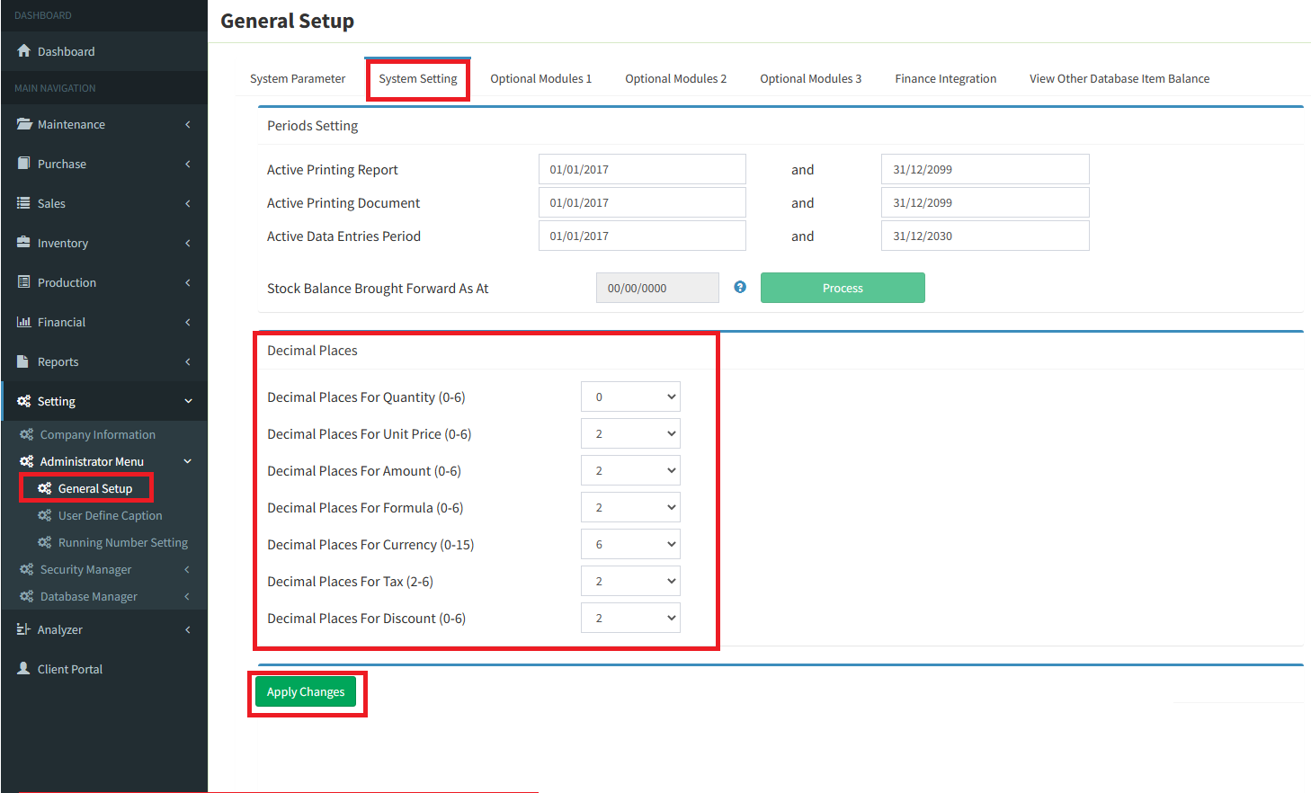 2-Next, click button “System Setting>>Decimal Places For (0-6)” as print screen below: