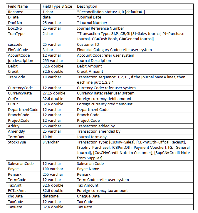 Table Specification (from third party module to SKYBIZ Cloud Server)