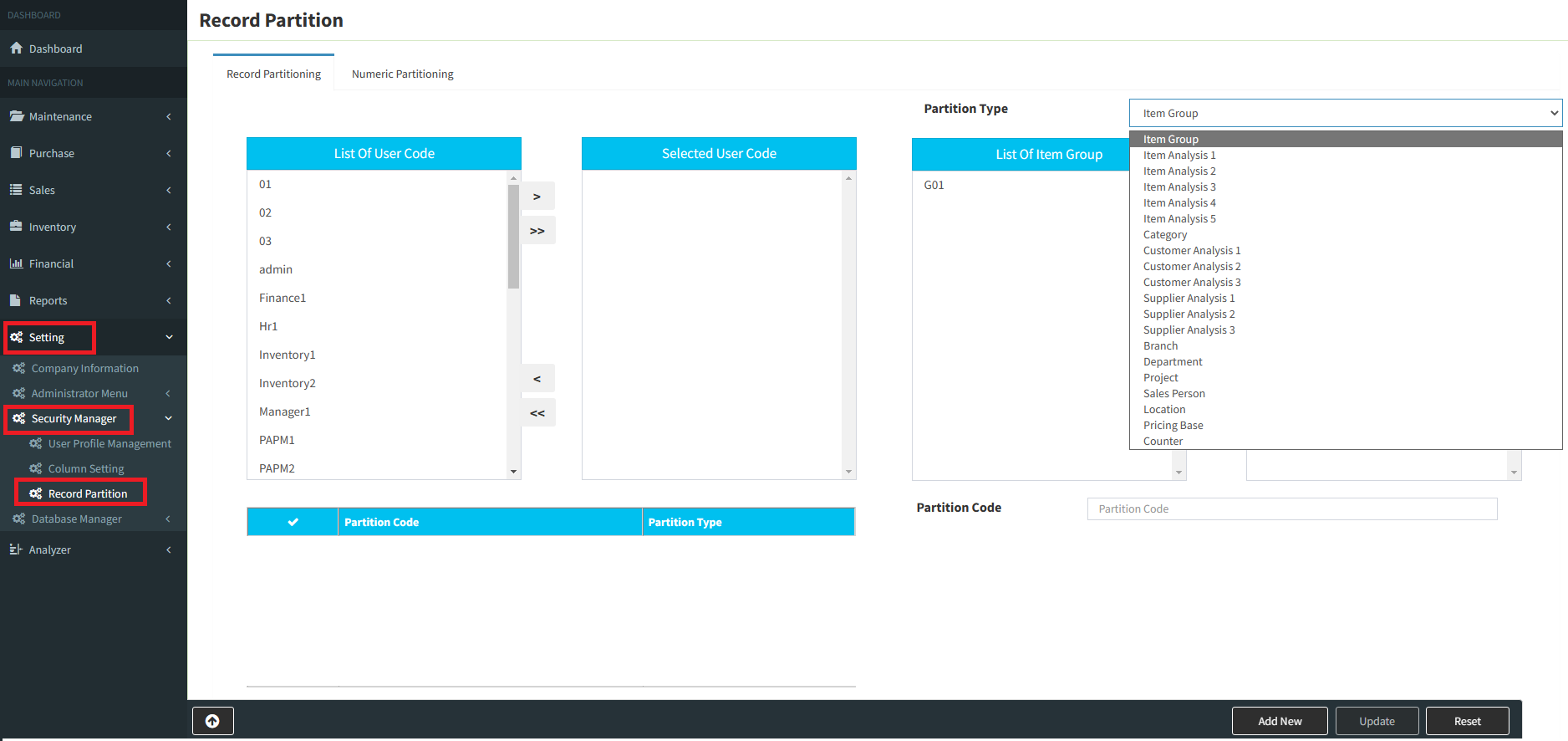 Step 1: Go to System >> Security Manager >> Records Partitioning