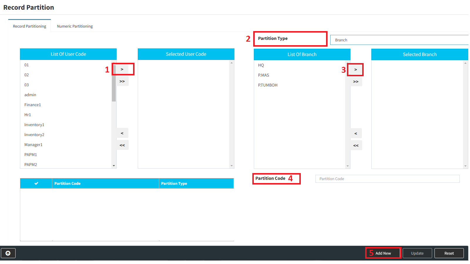 2. Choose the Partition Type. (Eg: Branch, if you want control by Branch)