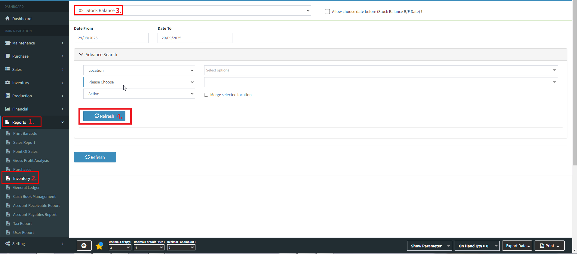 2019-10-16 0706. Inventory Below are guideline(s) to print stock balance report: Click on the Report Inventory Choose>>Stock Balance Refresh Powered By : SKYBIZ ® Beyond Cloud ™