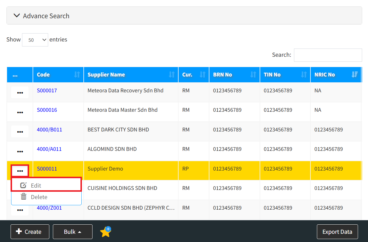 Step 2: Click the 3-Dots icon, then click Edit to modify your supplier