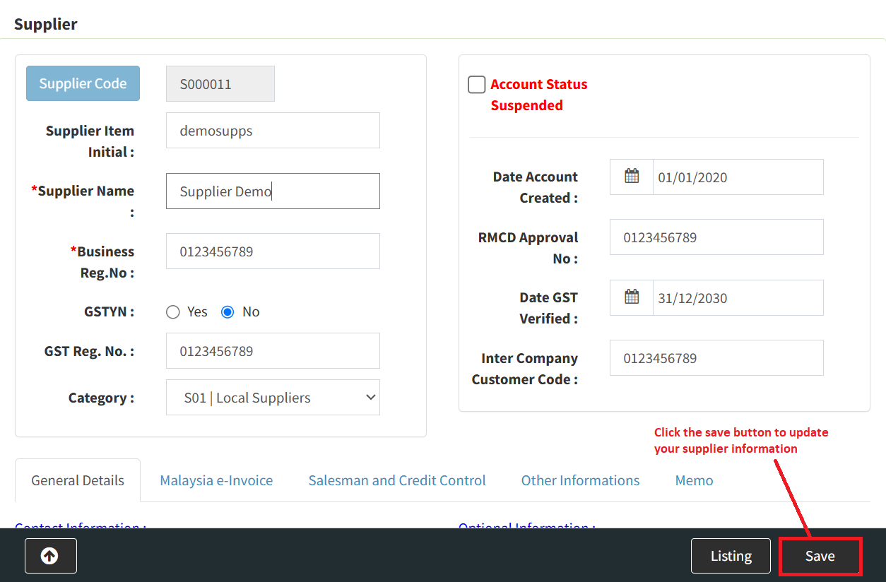 Step 3: After modifying your supplier, click the Save button to update your supplier.