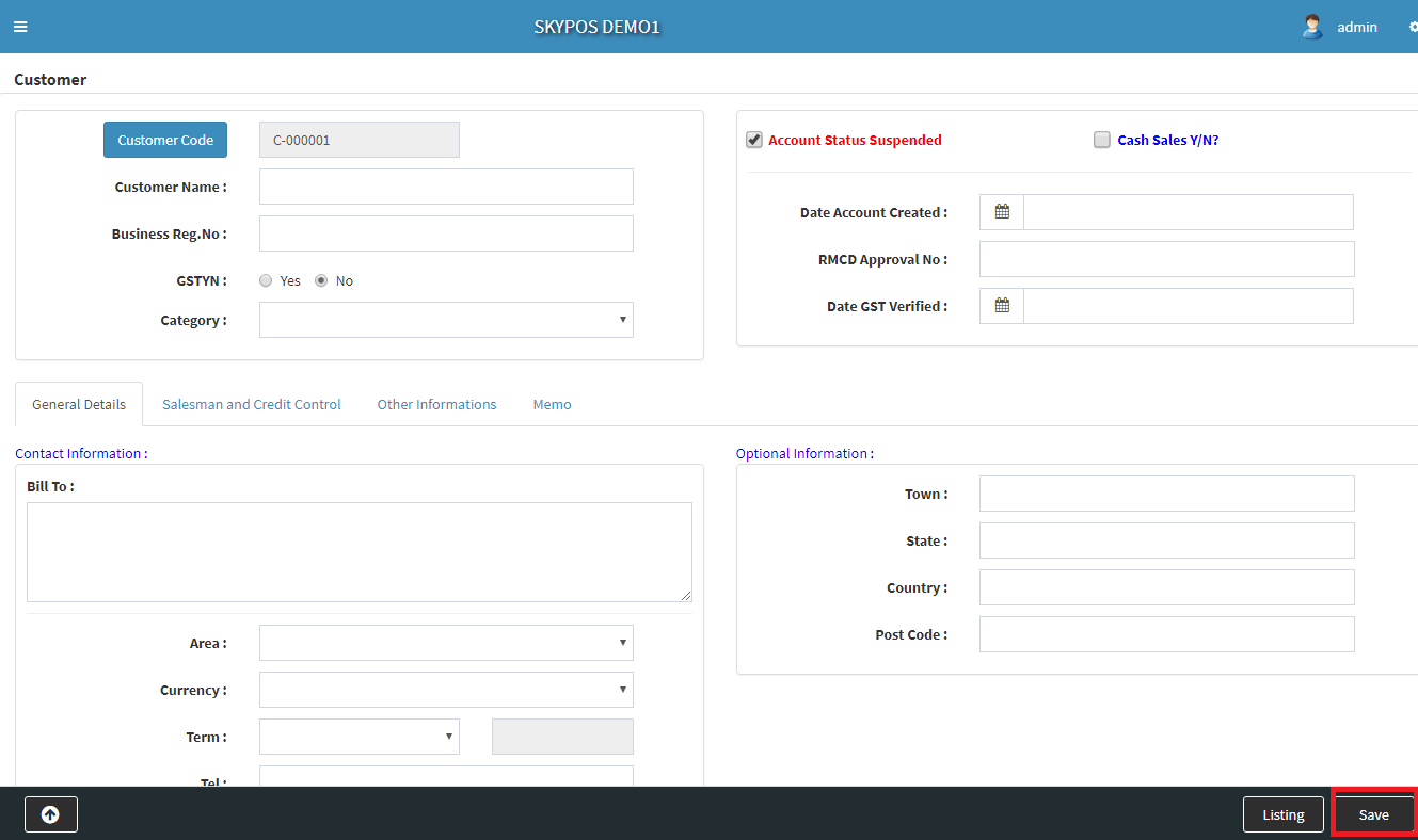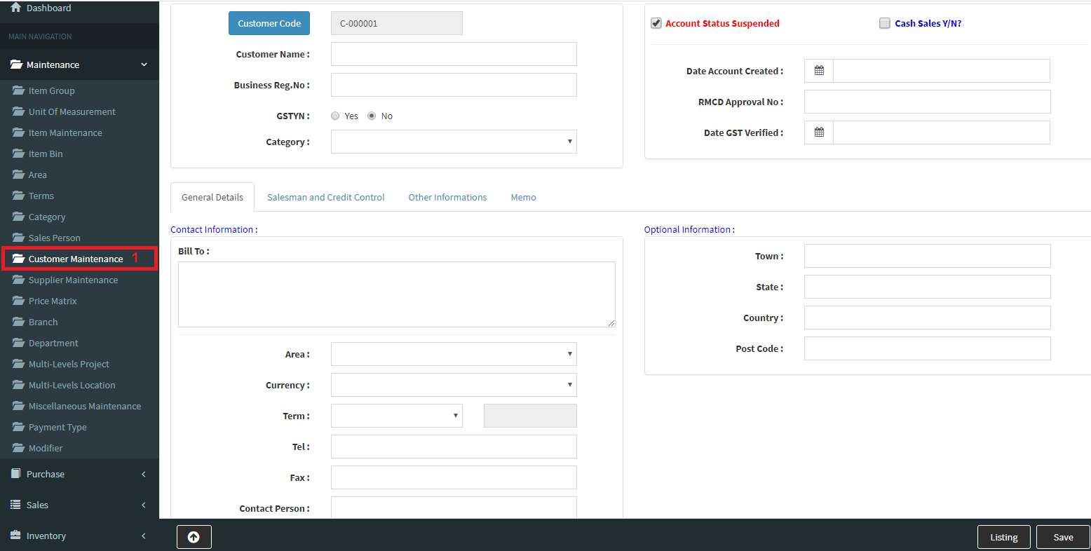 2. After that, click button “Customer Maintenance and then click button ” Account Status Suspended” as screen print below: