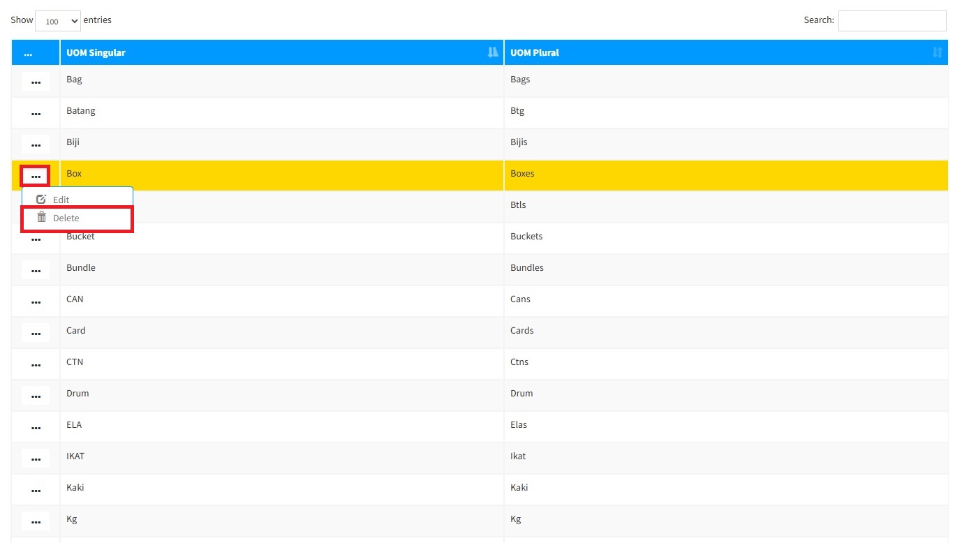 Step 2: Click the 3-Dots icon, then click Delete to remove your UOM