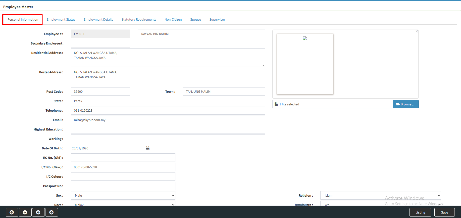 Step 2 : [ Personal Information ] >> Fill in employee code and employee personal information