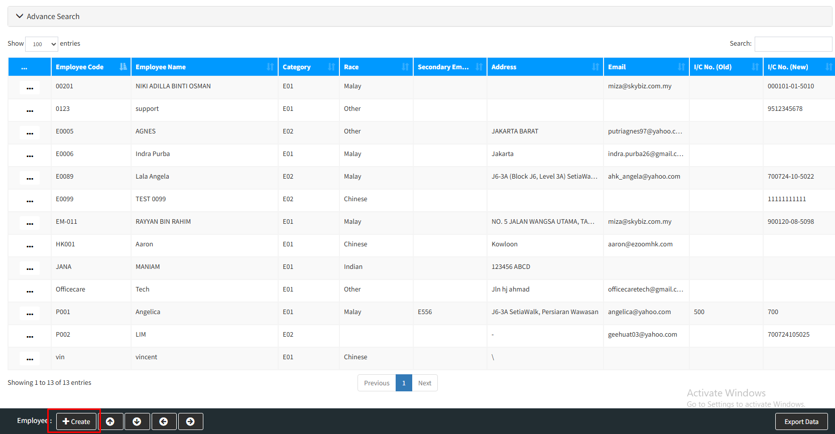 Step 1 : LOGIN SKYBIZ PAYROLL >> go to [ Maintenance ]>> [ Employee Master ]>> [ + Create ]