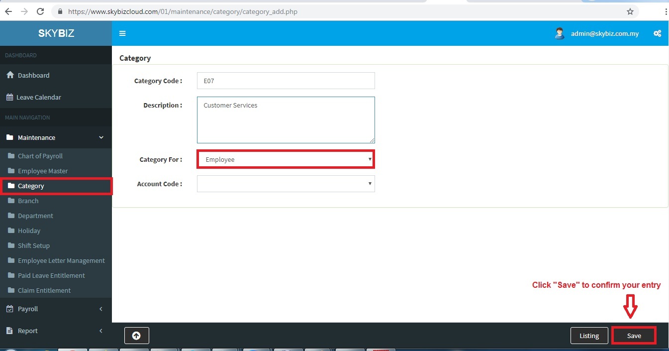 4. Fill up all information Category Code , Description, Category For is Employee.