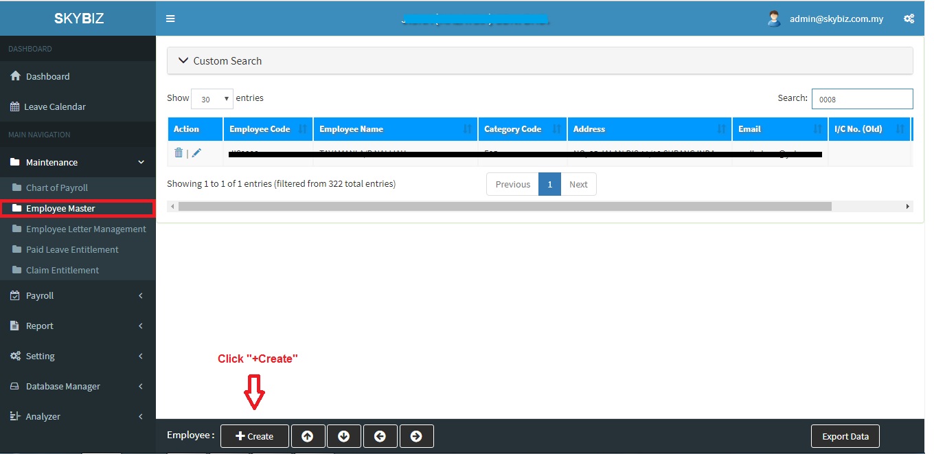 1. Click “Maintenance>>Employee Master>>+Create“.