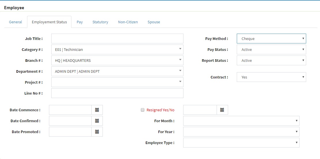 5. Fill up all information in “Employment Status” page, like Job Title, Category, Branch, Department, Date Commence, Date Confirmed, Date Promoted.