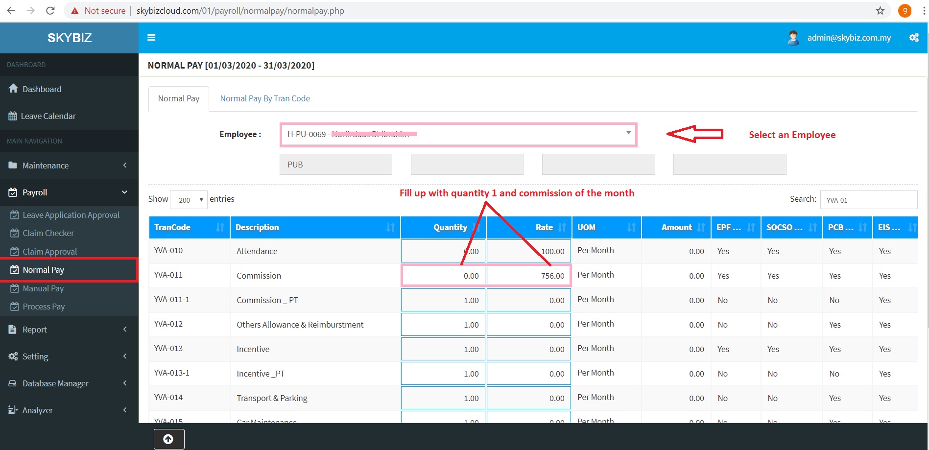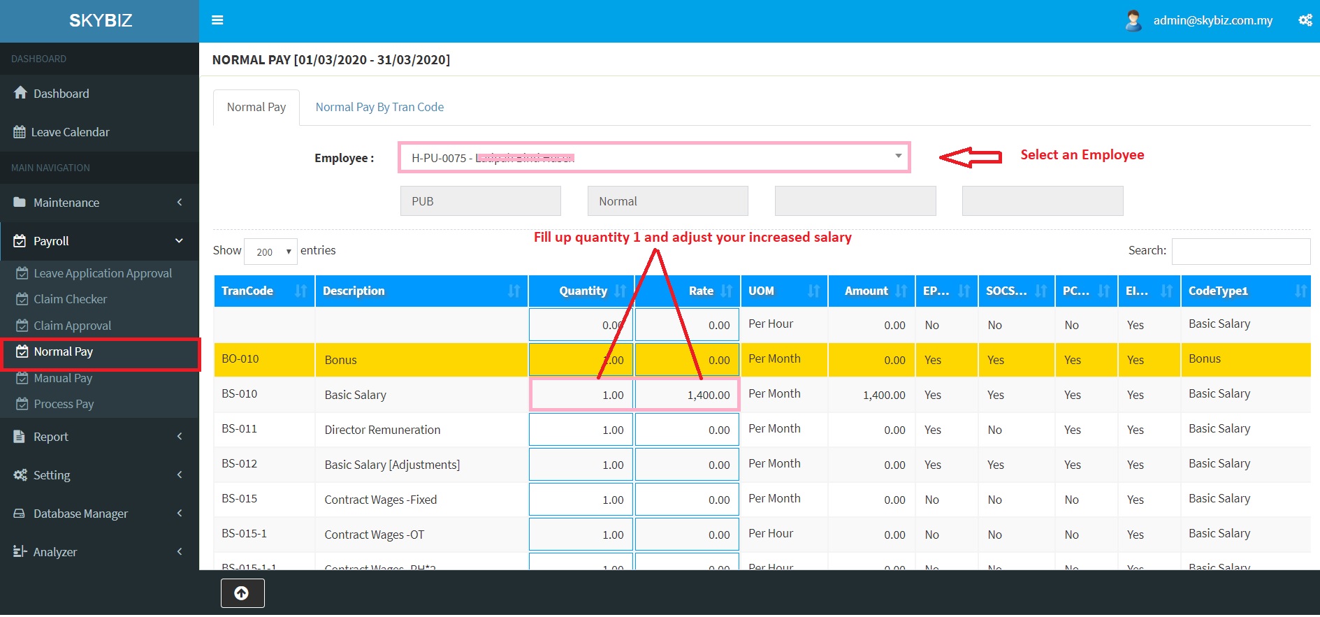 1. Click “Payroll>>Normal Pay>>Select an Employee“.