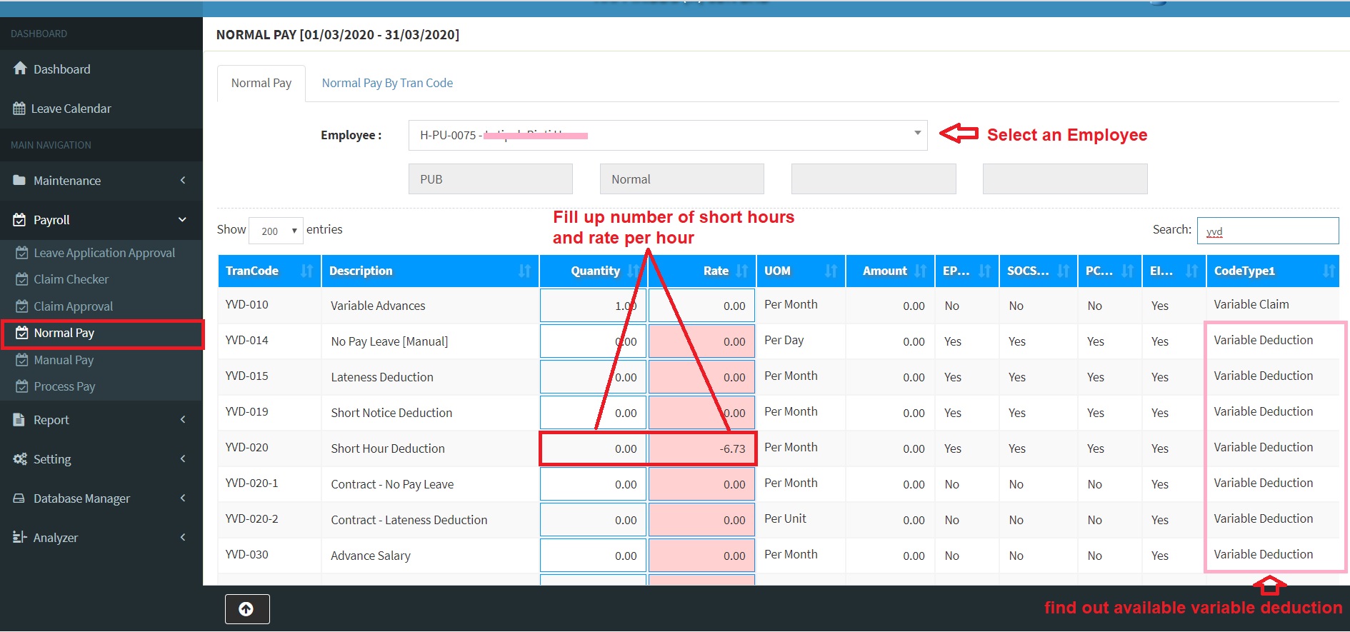4. Example : Below screen shot is assumed you would like to amend short hour deduction for the month.
