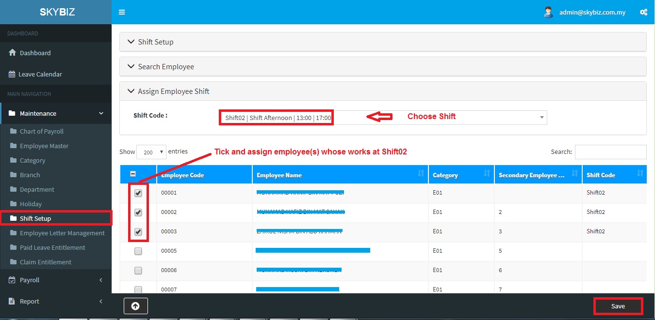 11. Choose Shift Code, tick and assign employee(s)