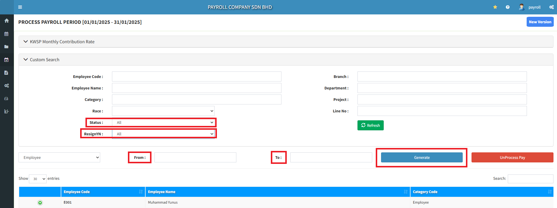 6. Go to Report >> Payslip >> Status “All“ >> Resign “All“ >> Select Date and Print.
