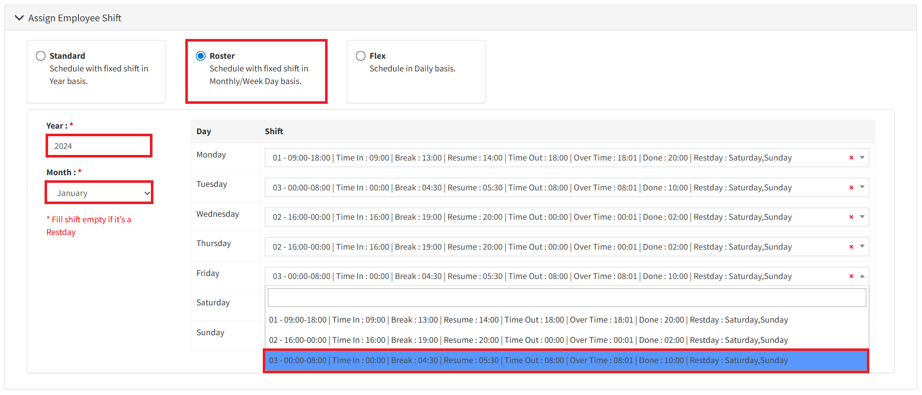 • The Standard Shift is designed for office-based employees whose working schedule remains consistent and does not change. Enter the year, then select the shift.