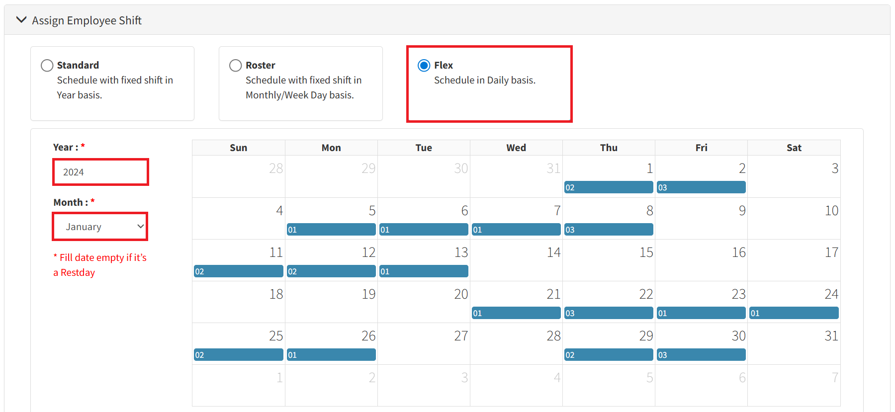 • The Flex Shift is scheduled on a daily basis and is suitable for employees with highly dynamic working hours. Similar to the Roster Shift, but it offers more flexibility by allowing shifts to be assigned individually for each day.