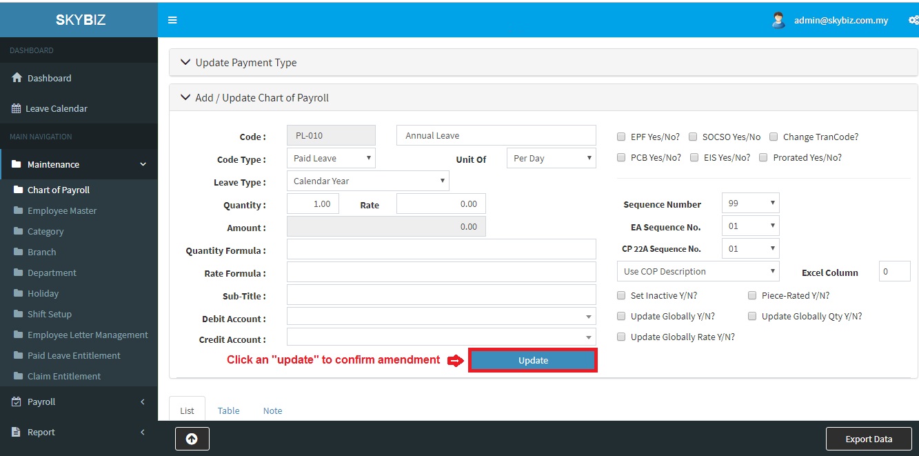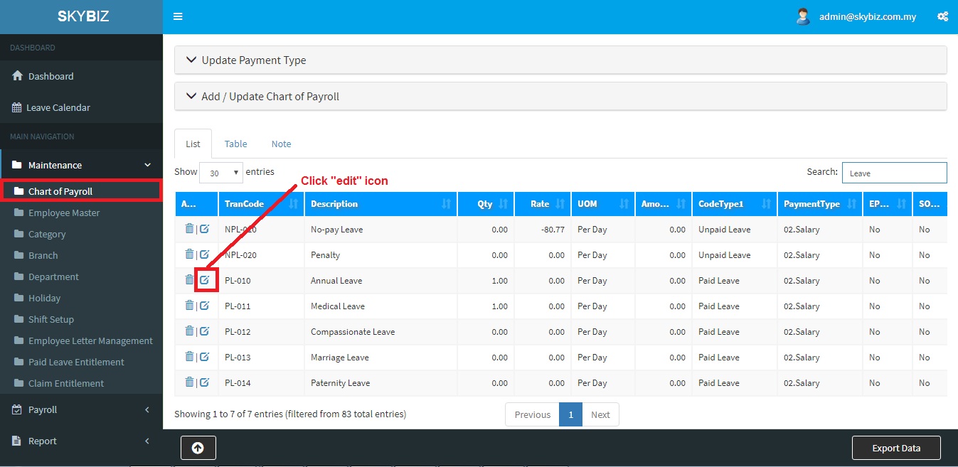 - Login to Payroll Management portal and then go to menu “Maintenance>>Chart of Payroll“.