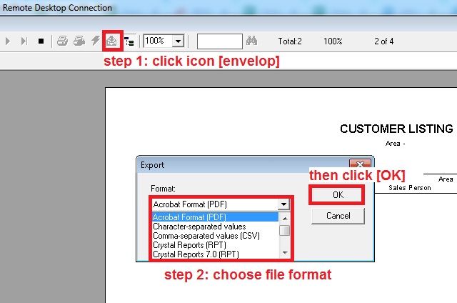 1. Preview the report/document you want to export, then click on icon [envelop], it will appear a export form and show you the file format.