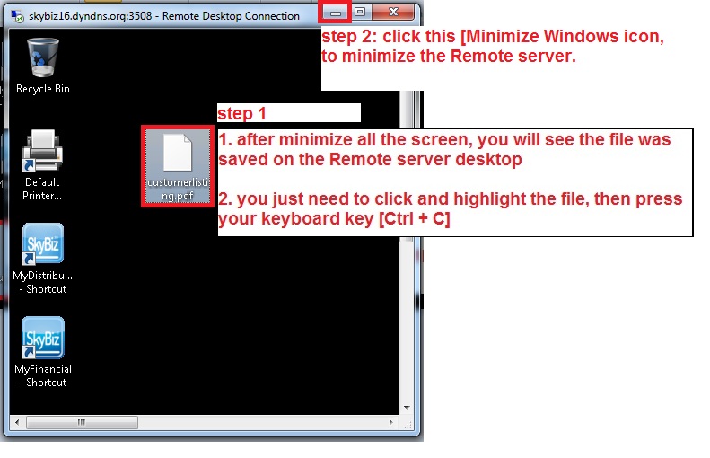 5. After that, upon minimize all the screen, user will see the file exported is saved on Remote server Desktop folder. Next, user is advice to highlight the exported file, then press keyboard button [Ctrl + C] to copy the file in clipboard.