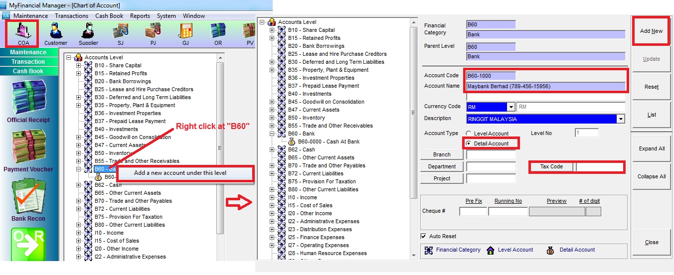 - Right click Category “B60” (assume to create new bank account code) and click “Add a new account under this level“.