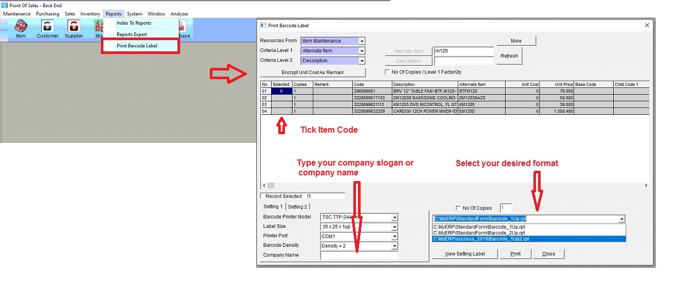 - Tick Item Code those would like to print, type your company name, choose correct preset format and click print.