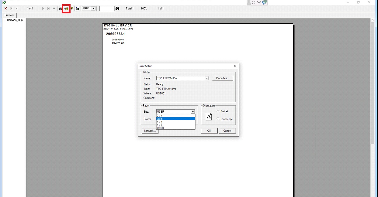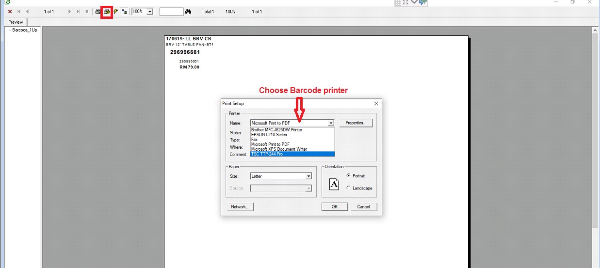 - Click “Printer Setup”, Choose correct barcode printer example TSC244, etc